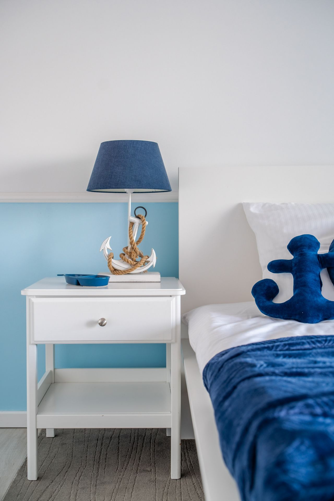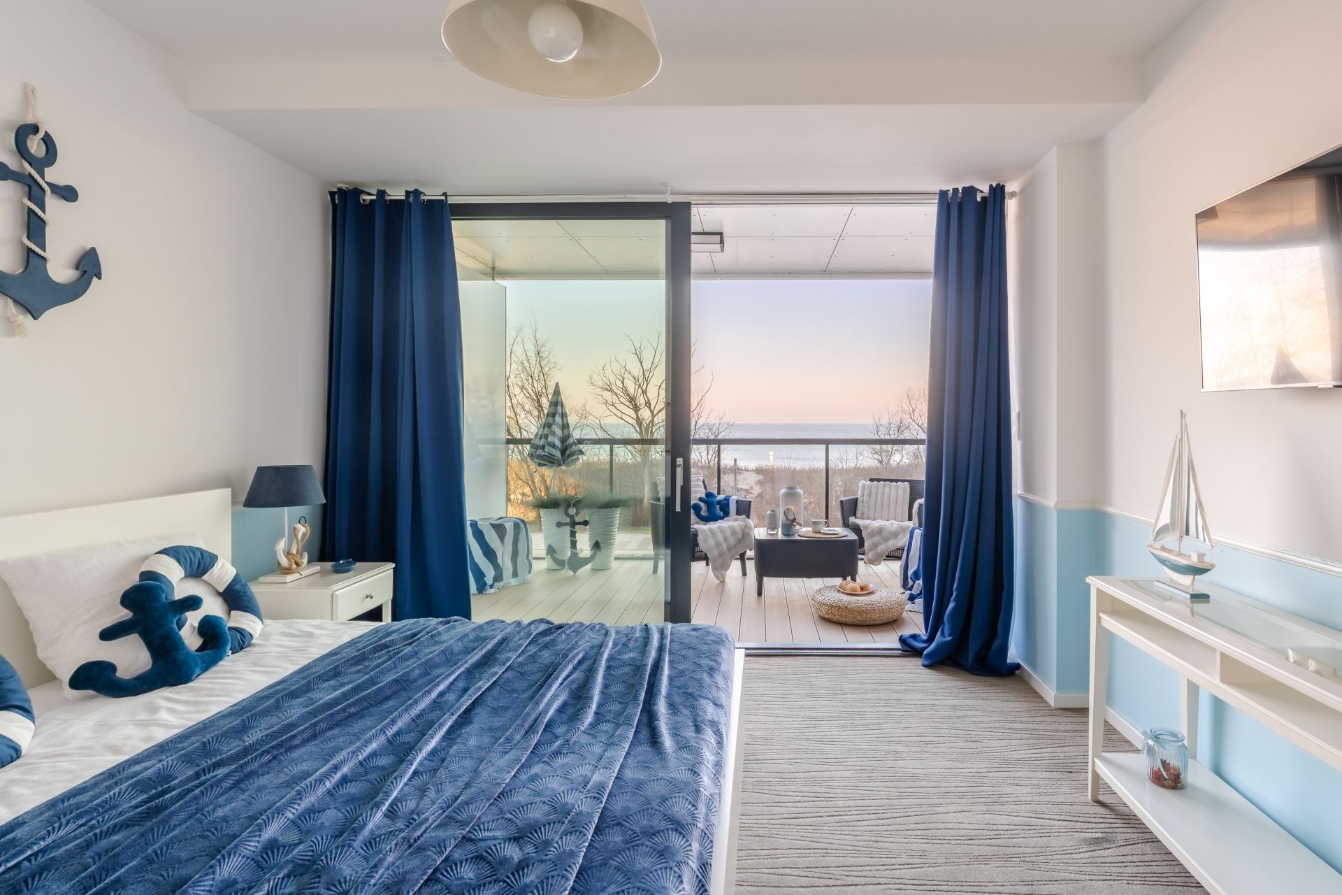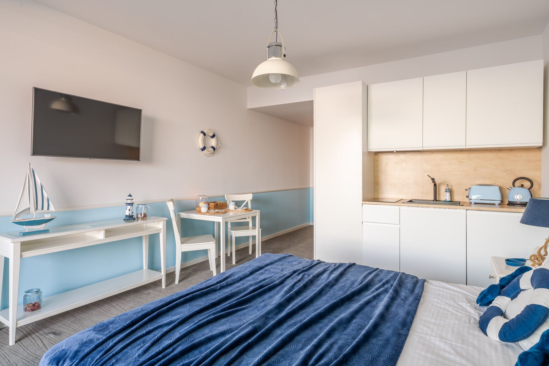 Apartament urządzony jest w stylu marynistycznym – jasne barwy, naturalne tkaniny i subtelne dodatki tworzą przytulną przestrzeń sprzyjającą relaksowi. To doskonały wybór na pobyt zarówno dla pary, jak i małej rodziny.