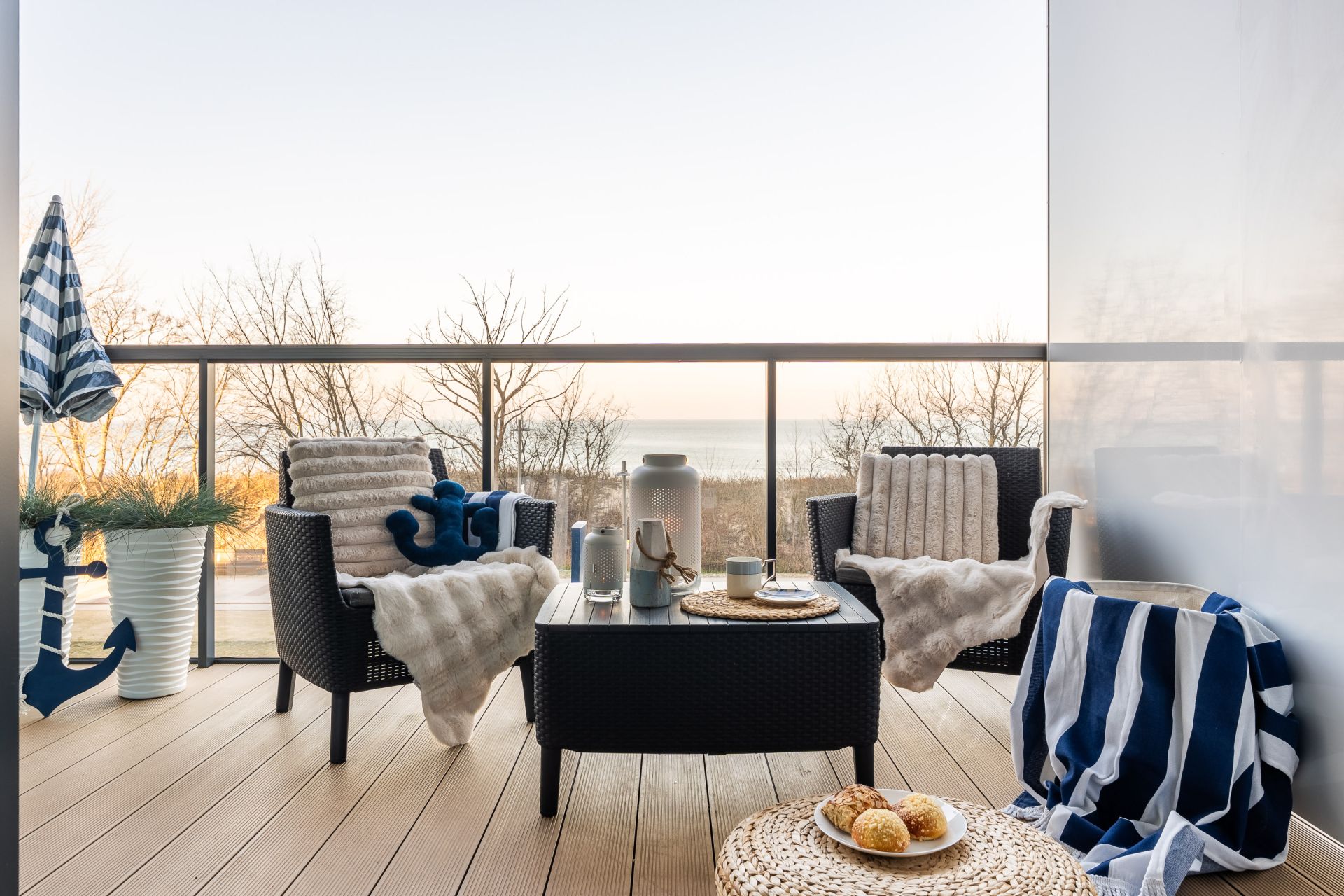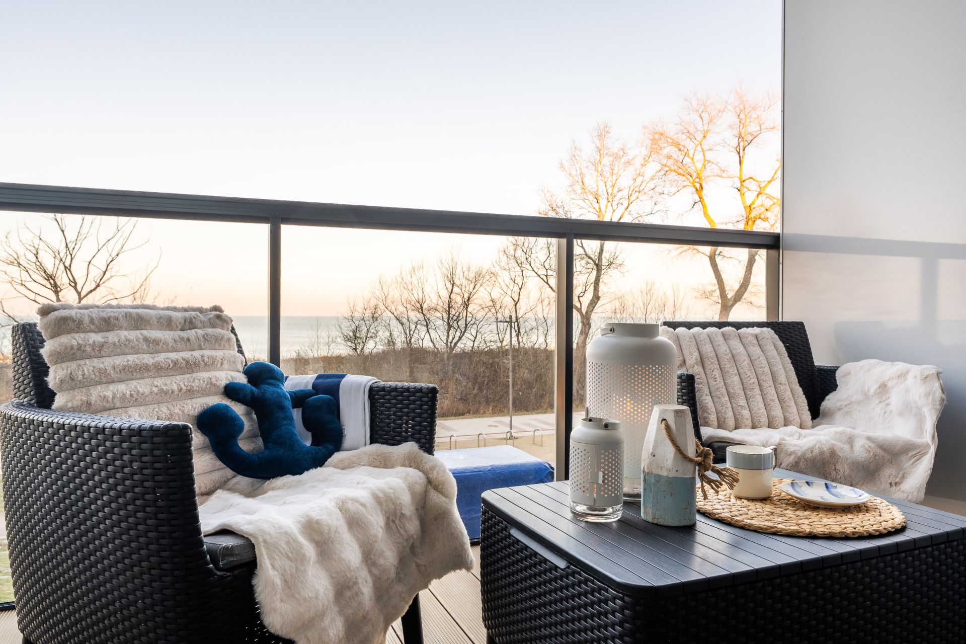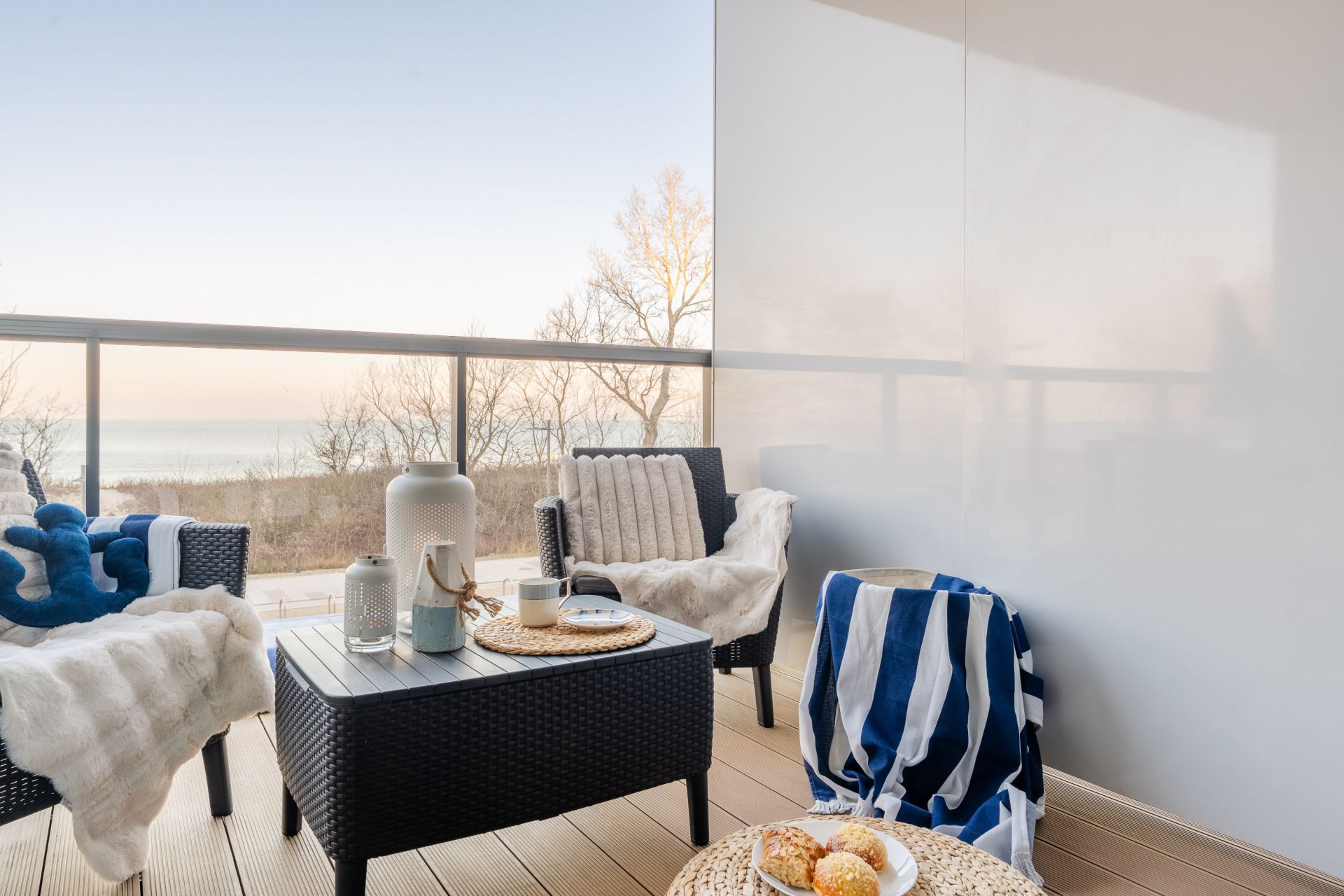 Apartament urządzony jest w stylu marynistycznym – jasne barwy, naturalne tkaniny i subtelne dodatki tworzą przytulną przestrzeń sprzyjającą relaksowi. To doskonały wybór na pobyt zarówno dla pary, jak i małej rodziny.