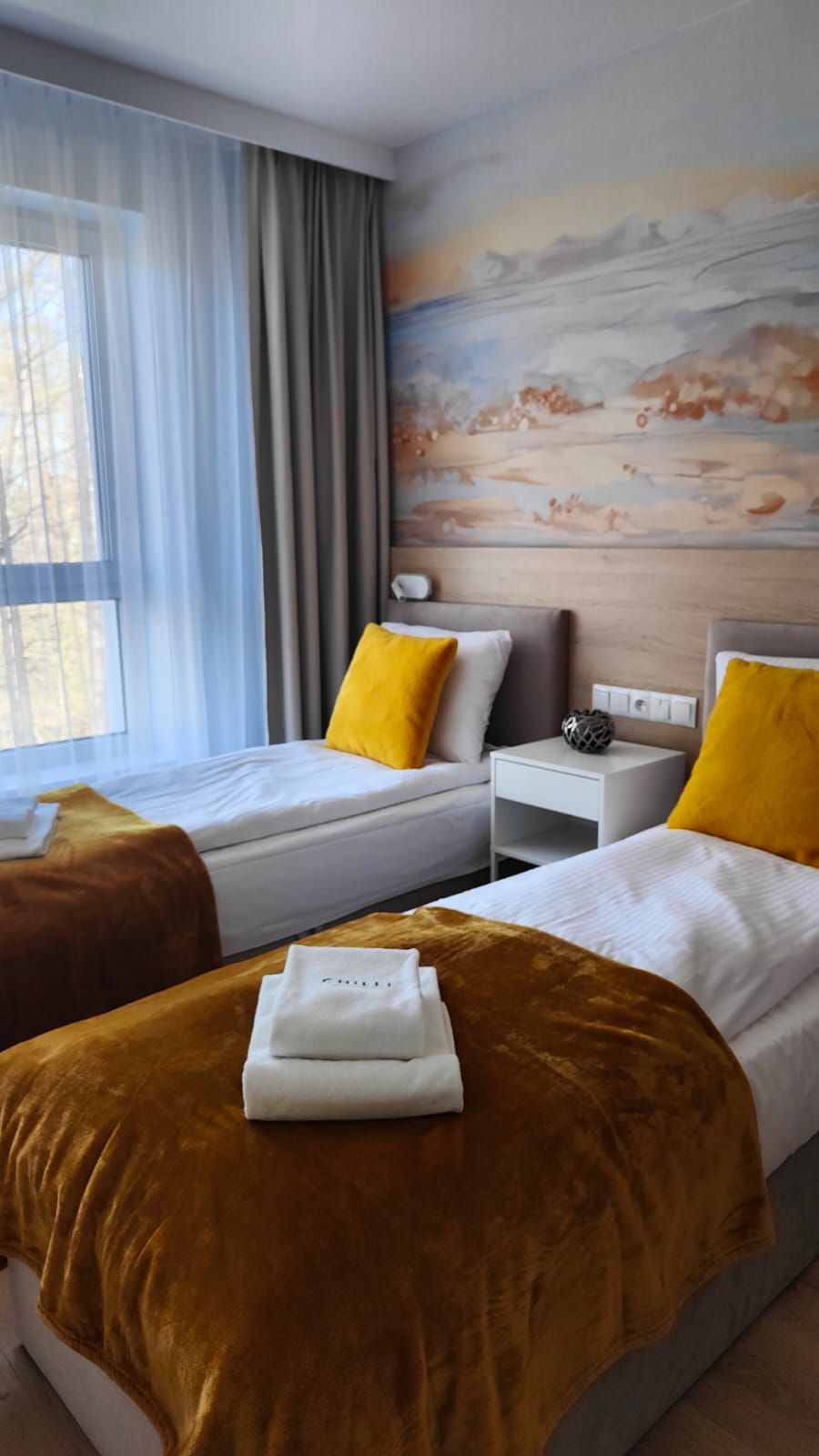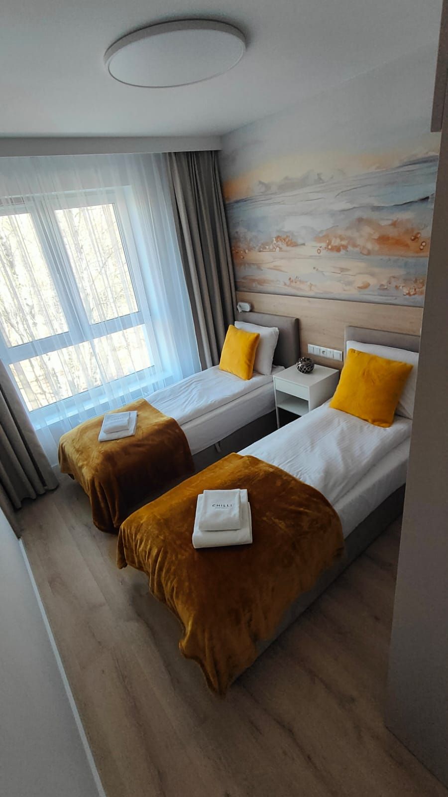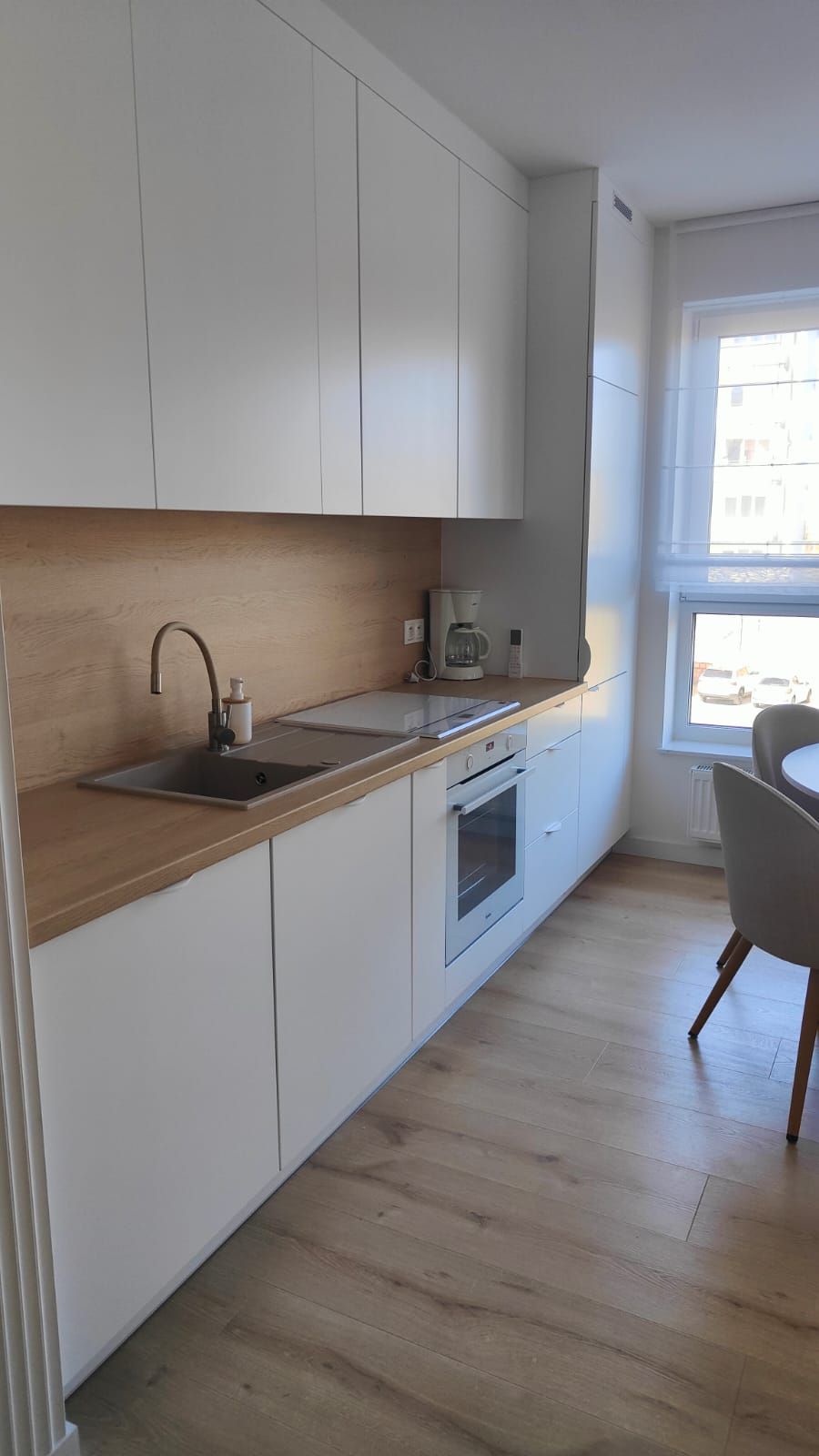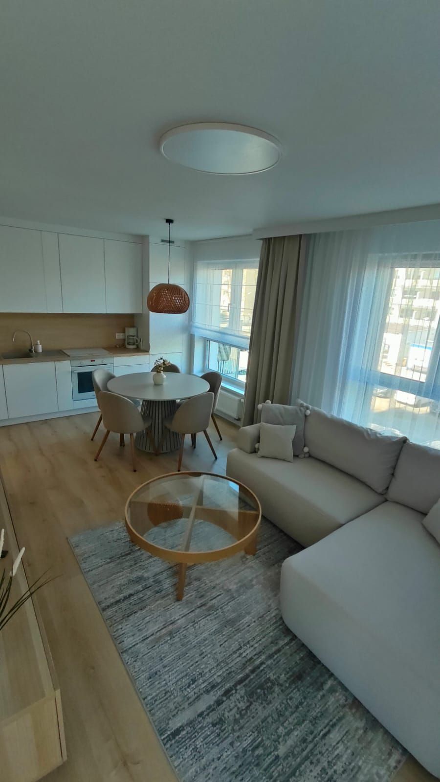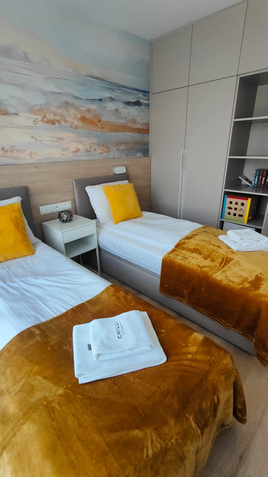 Mieszkanie składa się z dwóch oddzielnych sypialni oraz jasnego salonu z aneksem kuchennym, co zapewnia komfort i prywatność wszystkim gościom. Apartament został w pełni wyposażony we wszystkie niezbędne udogodnienia, aby pobyt był wygodny i bezproblemowy.